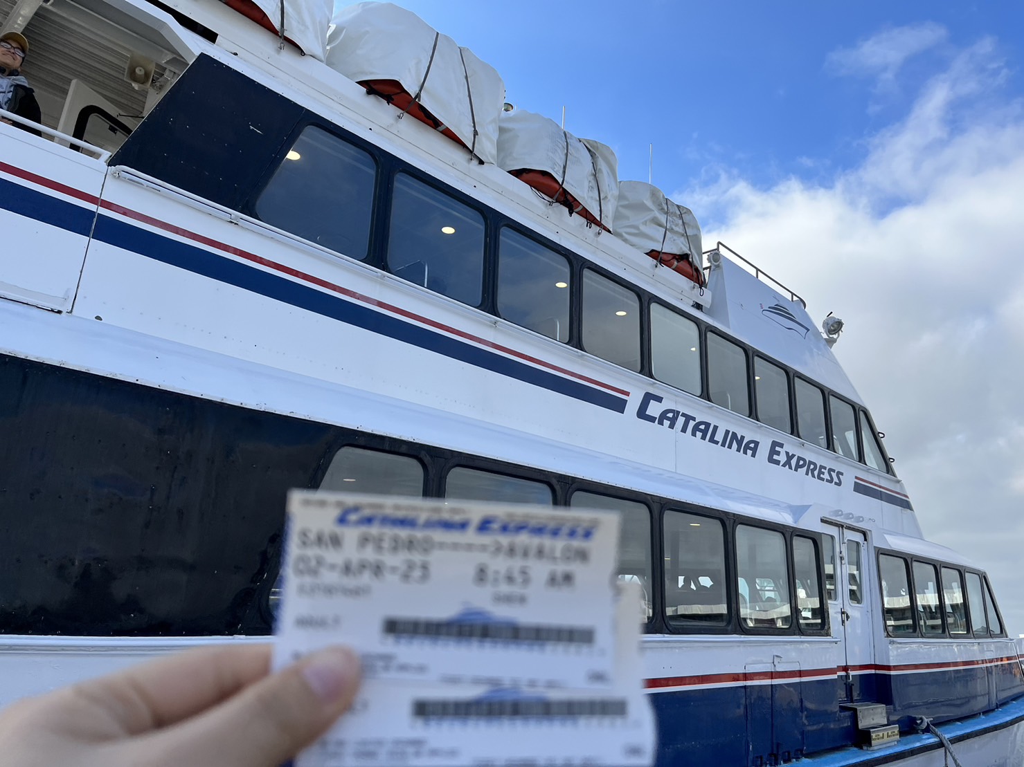4/2一早7:30出門,搭8:45的船到聖卡塔利娜島(Santa Catalina Island),當天我們起了個大早趕了個晚機,到了以後不知道手機購買的票(信件)要先去換成實體票,導致都要上船了才發現要拿票,所以接近最後幾組才上船的人。