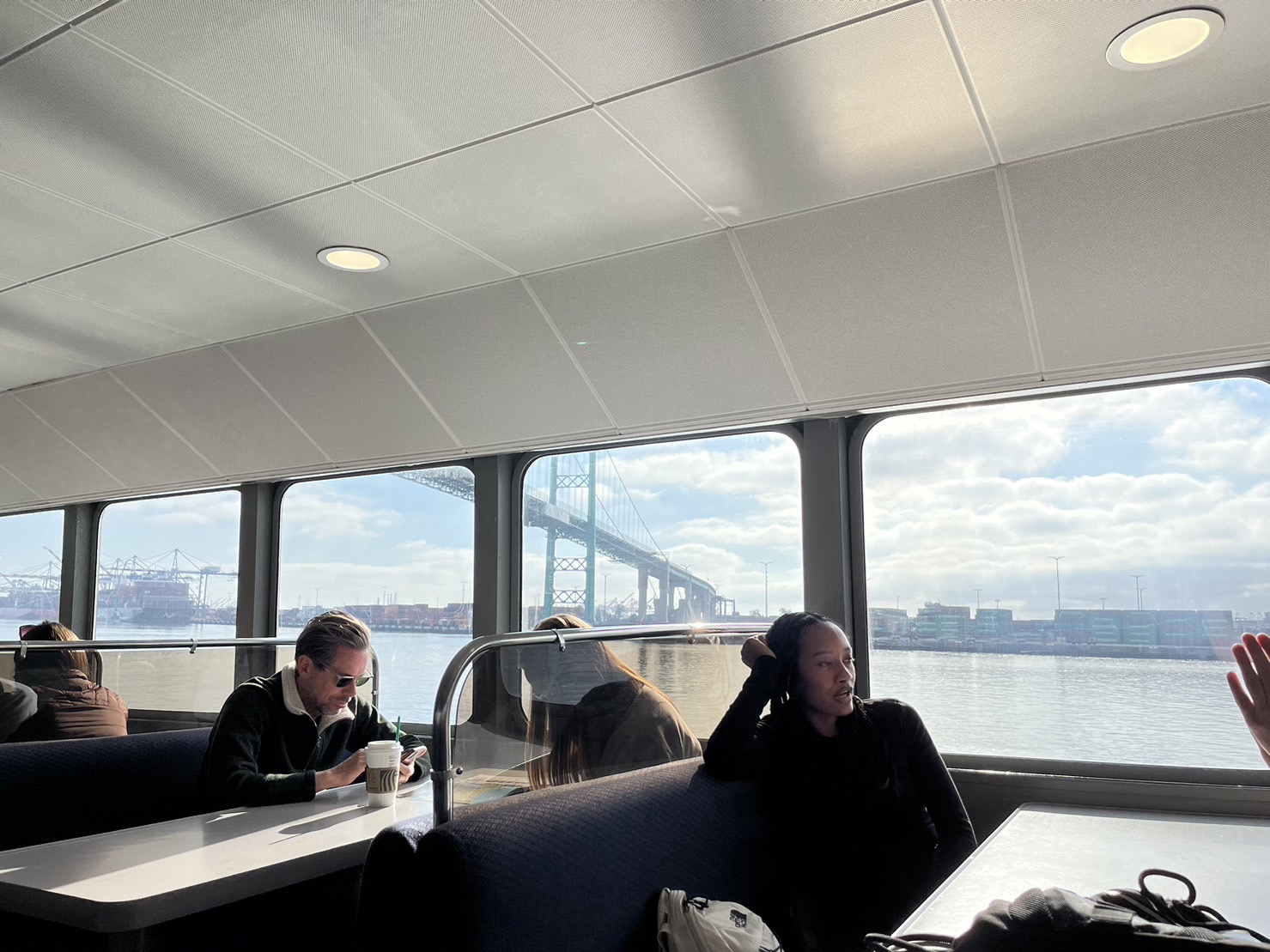 回程的船跟來的時候不太一樣,有比較多像電影院的位置,但我們回程很幸運,有靠窗看海的位置還有桌子,看來提早排隊還是很有用的!