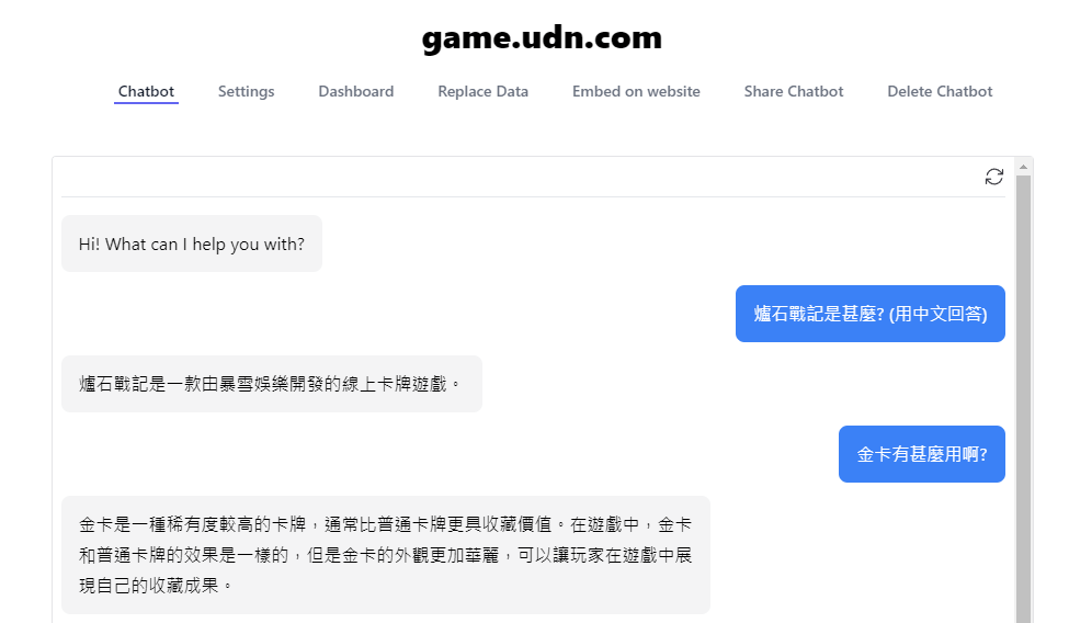 實際訓練情況因為是公司內部業務所以就沒辦法跟大家分享了,但以下的Chatbase進一步提供更簡單的方式讓你可以自己輕鬆玩chatGPT!在這邊附上一個簡單範例哈哈