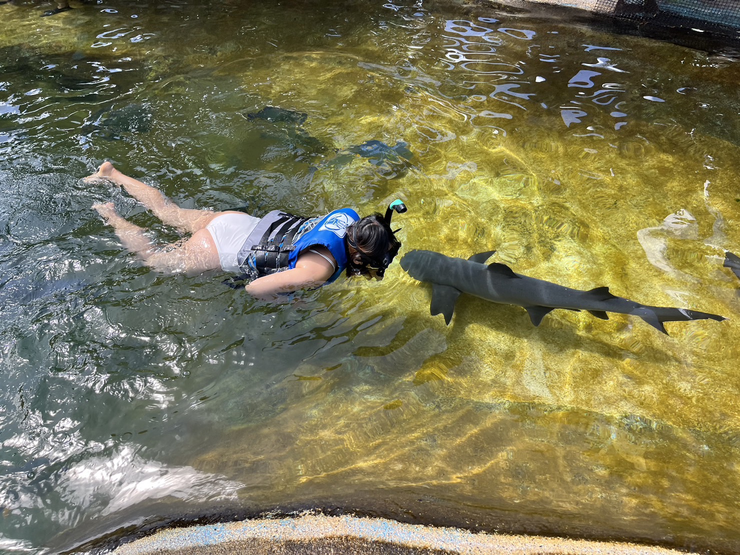 這裡總共有四隻鯊魚,都是被海洋公園的工作人員每天照料的,所以也習慣與人互動,也不害怕人,但也不要主動碰他們,畢竟不知道會不會有什麼反應(☉д⊙)沒有啦工作人員說,他們嘴巴其實很小,只能吃指頭大的魚,所以這也是後來我們比較可以放心跟他們游泳的原因~